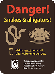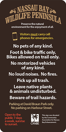 CANBE is financing the design and construction of new signage for the Nassau Bay Wildlife Peninsula, using dark colors similar to National Park signs. The signs will be robustly constructed to withstand the onslaught of future hurricanes and flooding to the greatest extent possible.