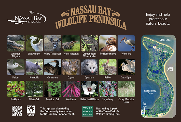 CANBE is financing the design and construction of new signage for the Nassau Bay Wildlife Peninsula, using dark colors similar to National Park signs. The signs will be robustly constructed to withstand the onslaught of future hurricanes and flooding to the greatest extent possible.